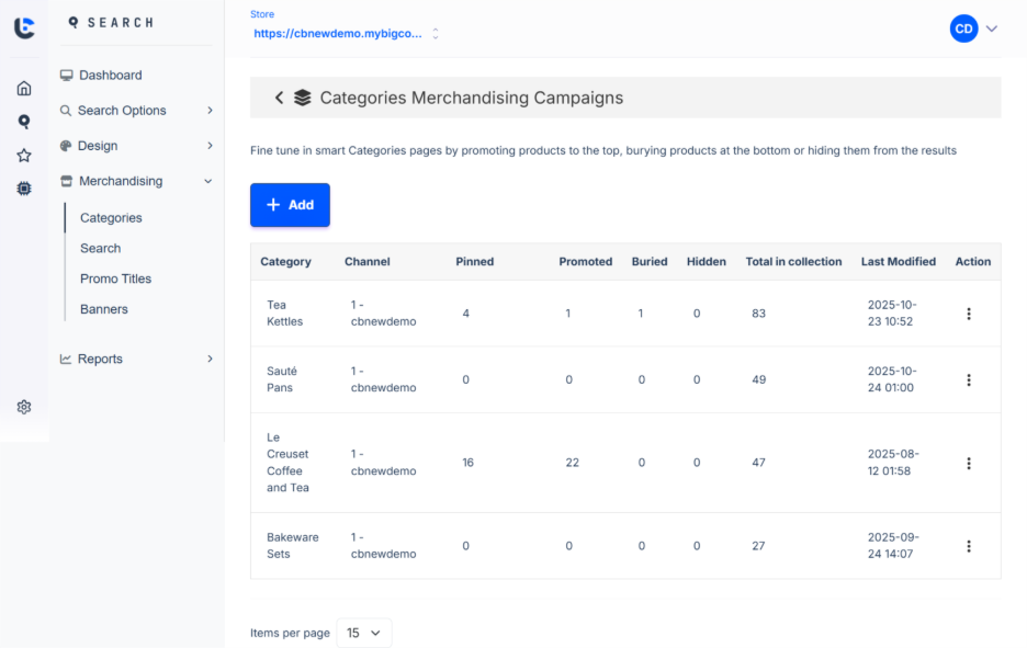 Set up merchandising preferences for collections. Define which products to pin, promote, bury, or hide within specific categories.