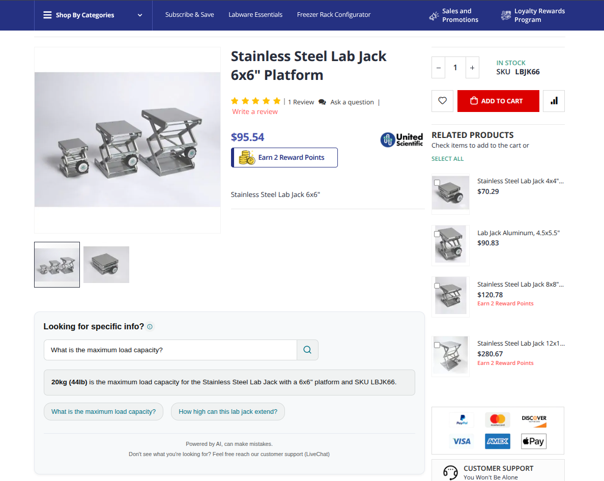After enabling intelligence for a particular SKU, you will see the chat widget on the corresponding product pages as shown below. The questions displayed are ConversionBox-generated suggestions, but you can also ask your own questions.
