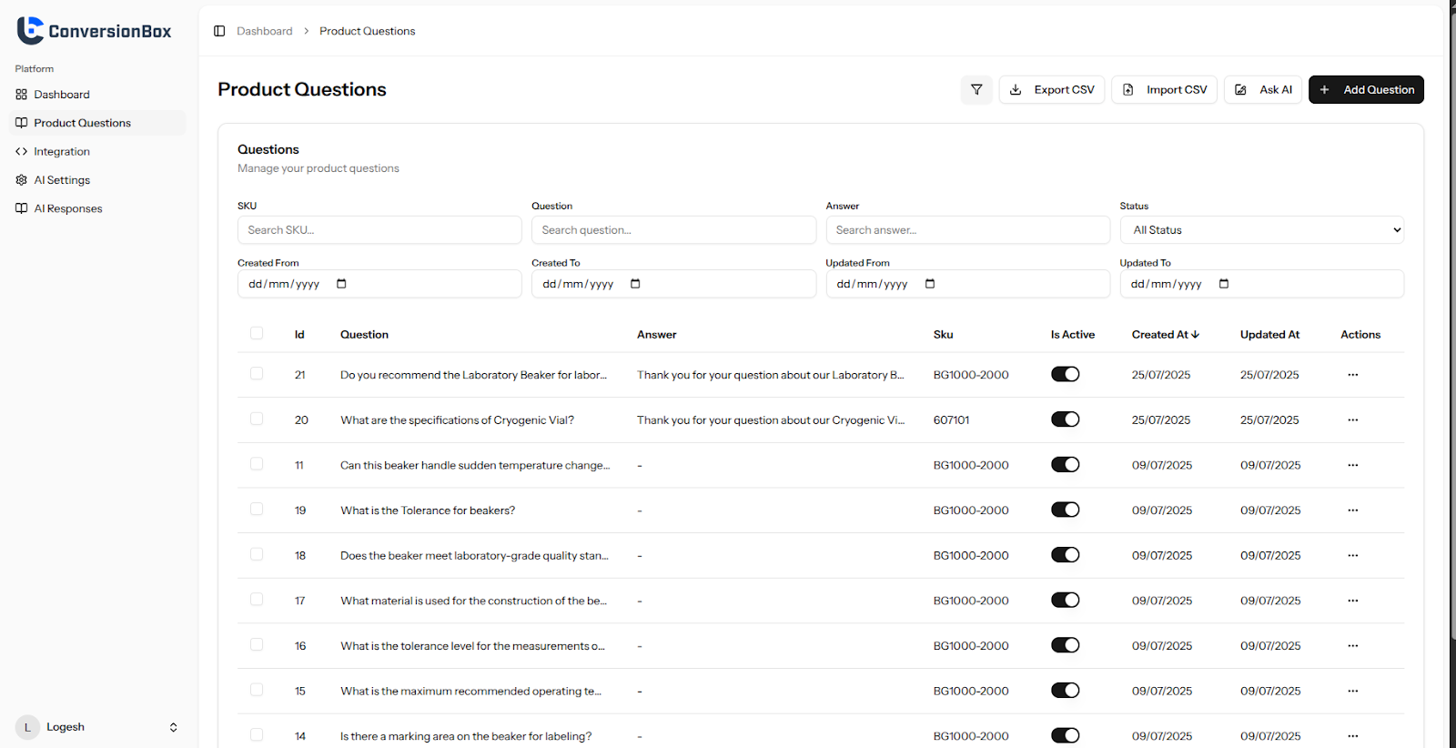 Search & Filter – Search by SKU, Question, Answer, Date, and Status.