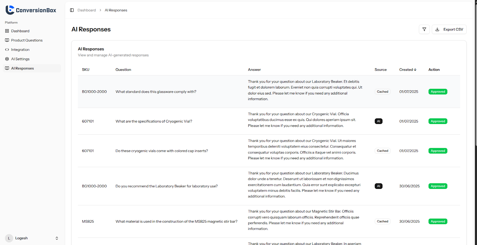 View Questions & Answers – See AI-generated or cached responses for each SKU.