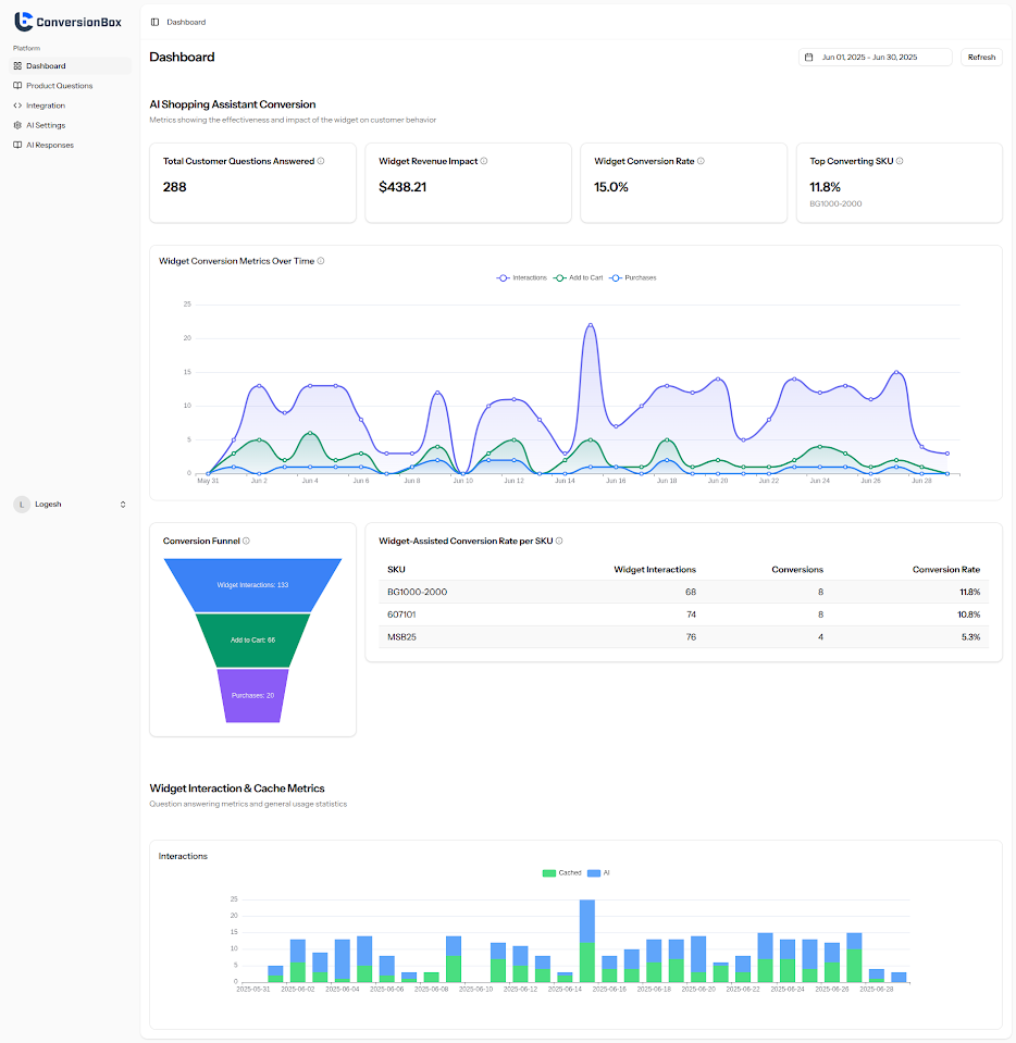 Widget Interaction & Cache Metrics – Split between AI responses and cached answers for faster delivery.