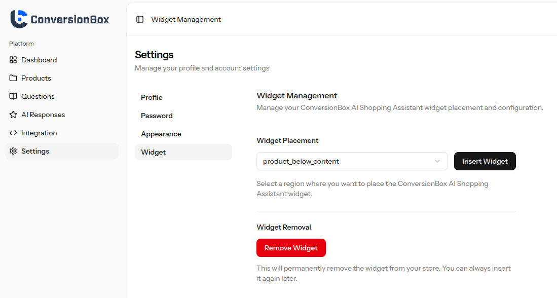 To relocate the widget, use the Widget Placement dropdown and select your preferred position on product pages.