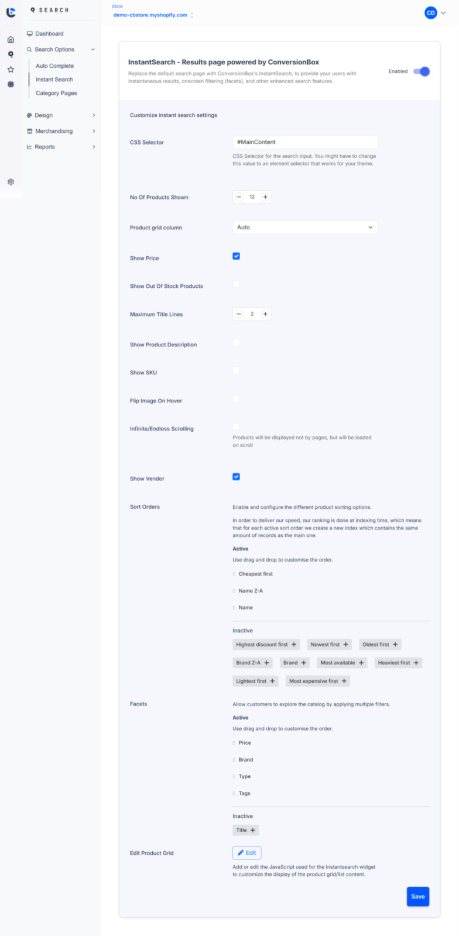 What it is The master toggle and initial configuration workflow that activates Instant Search and determines where ConversionBox will take over the store’s search results experience. Why it matters Turning Instant Search on redirects search queries ...