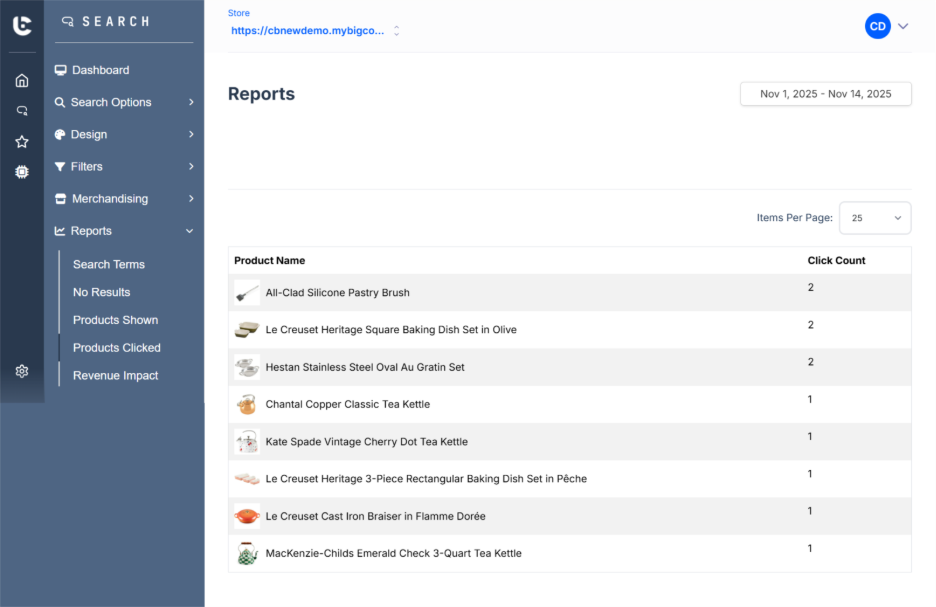 Click counts show how often each product is selected, helping you evaluate search relevance, product appeal, and optimize placement for higher conversions.